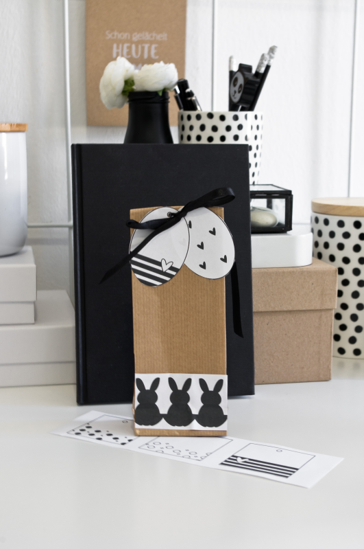 Hier habe ich auch gleich eine kleine Verpackungsinspiration für das Freebie mitgebracht. Hierfür habe ich eines unserer lebensmittelechten Bodenblockbeutel verwendet, die ovalen Anhänger ausgeschnitten, oben gelocht und an die Tüte angebracht. Die kleine Girlande habe ich länglich abeschnitten und unten an die Tüte geklebt, den Überschuss einfach abgeschnitten.